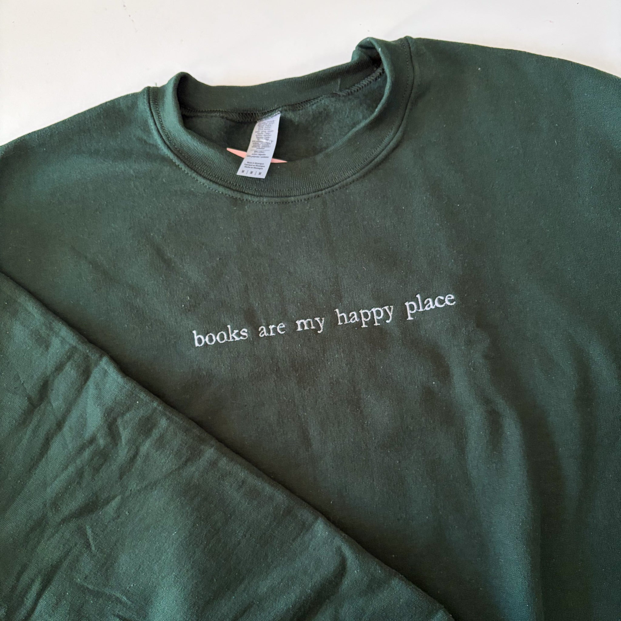 This bookish-inspired design is embroidered using white thread, onto a dark green crewneck.