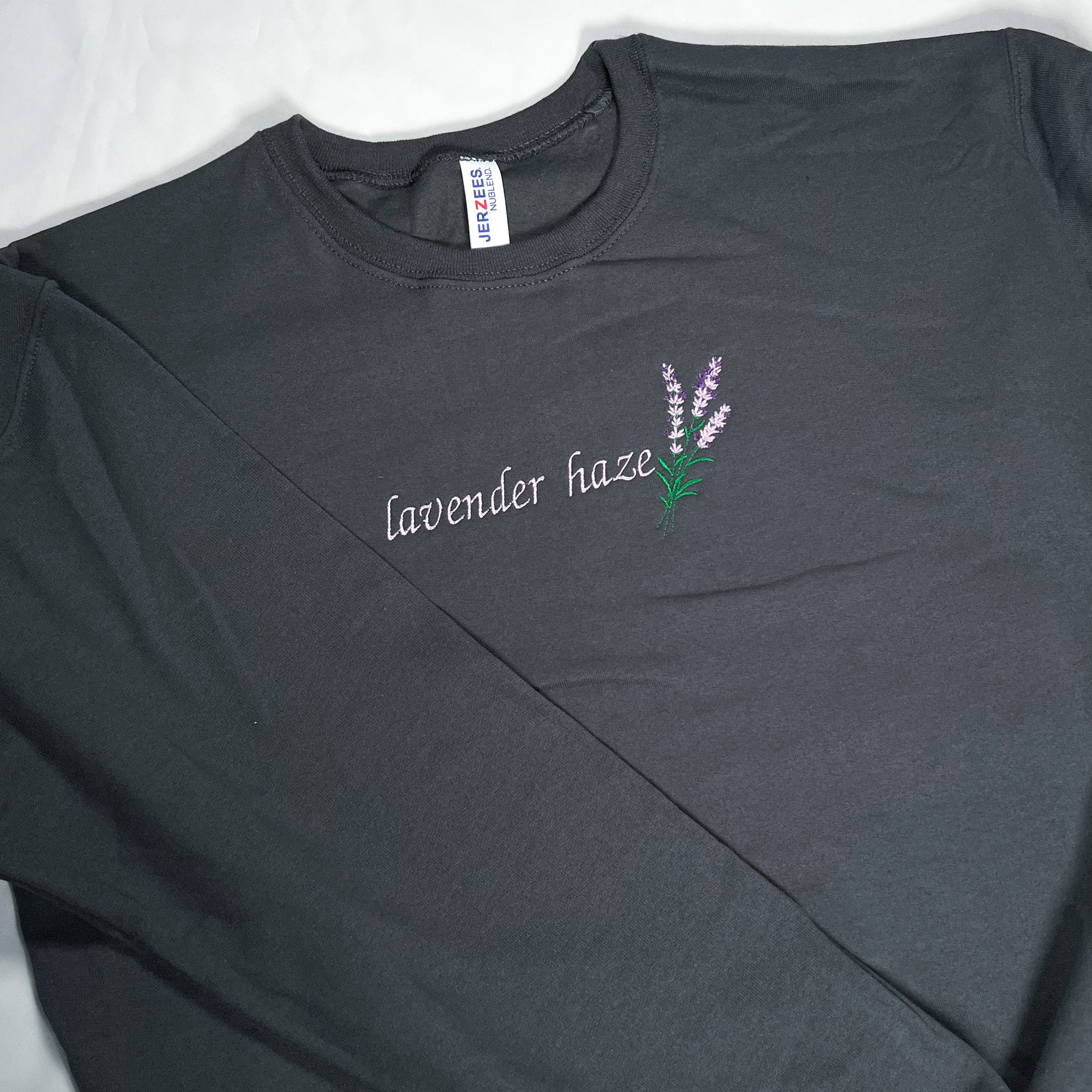 This Lavender Haze inspired design is embroidered using Lavender, green and purple thread, onto a Charcoal crewneck.