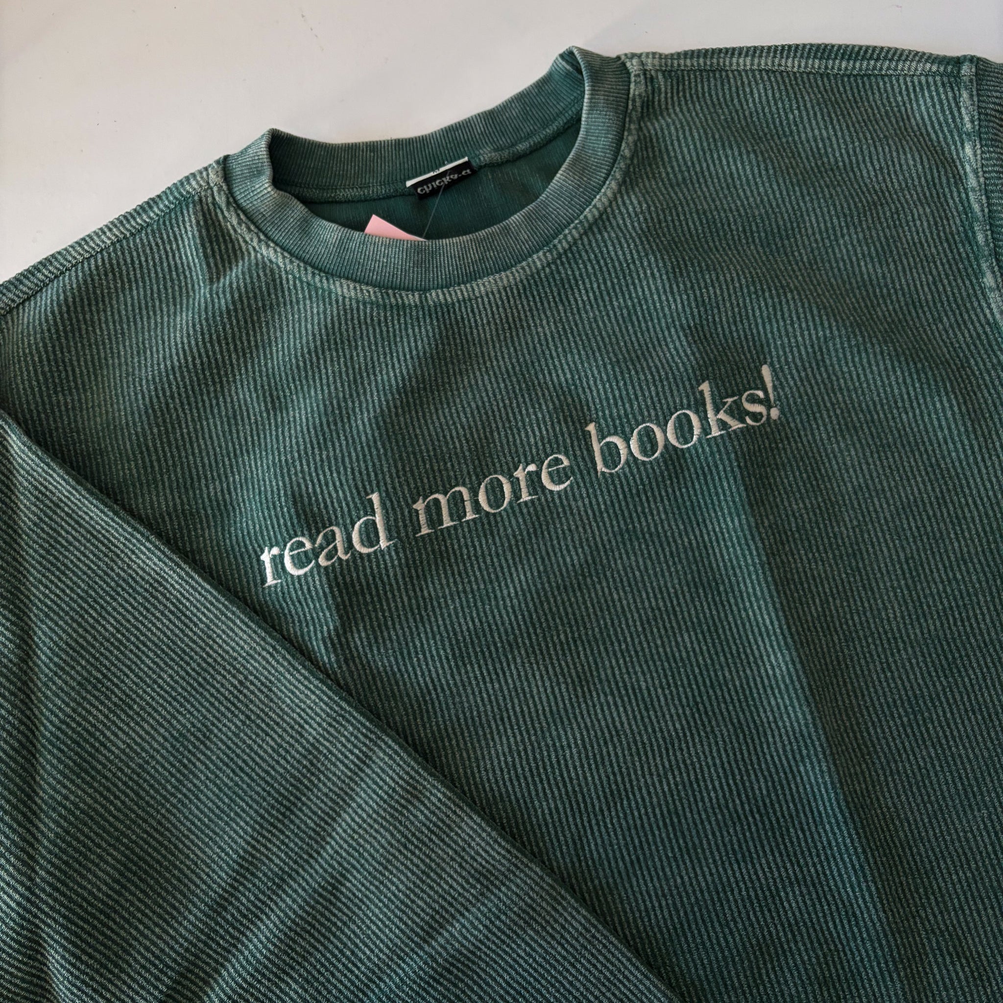 This bookish-inspired design is embroidered using cream thread onto a dark green ribbed crewneck.