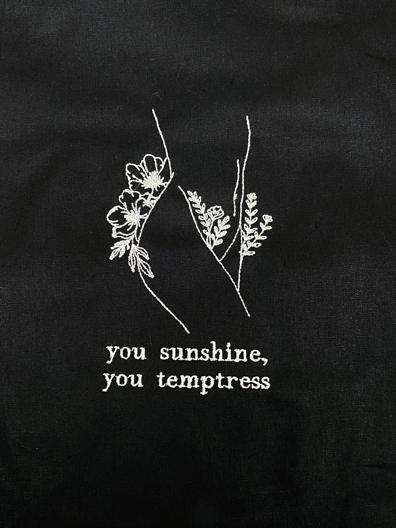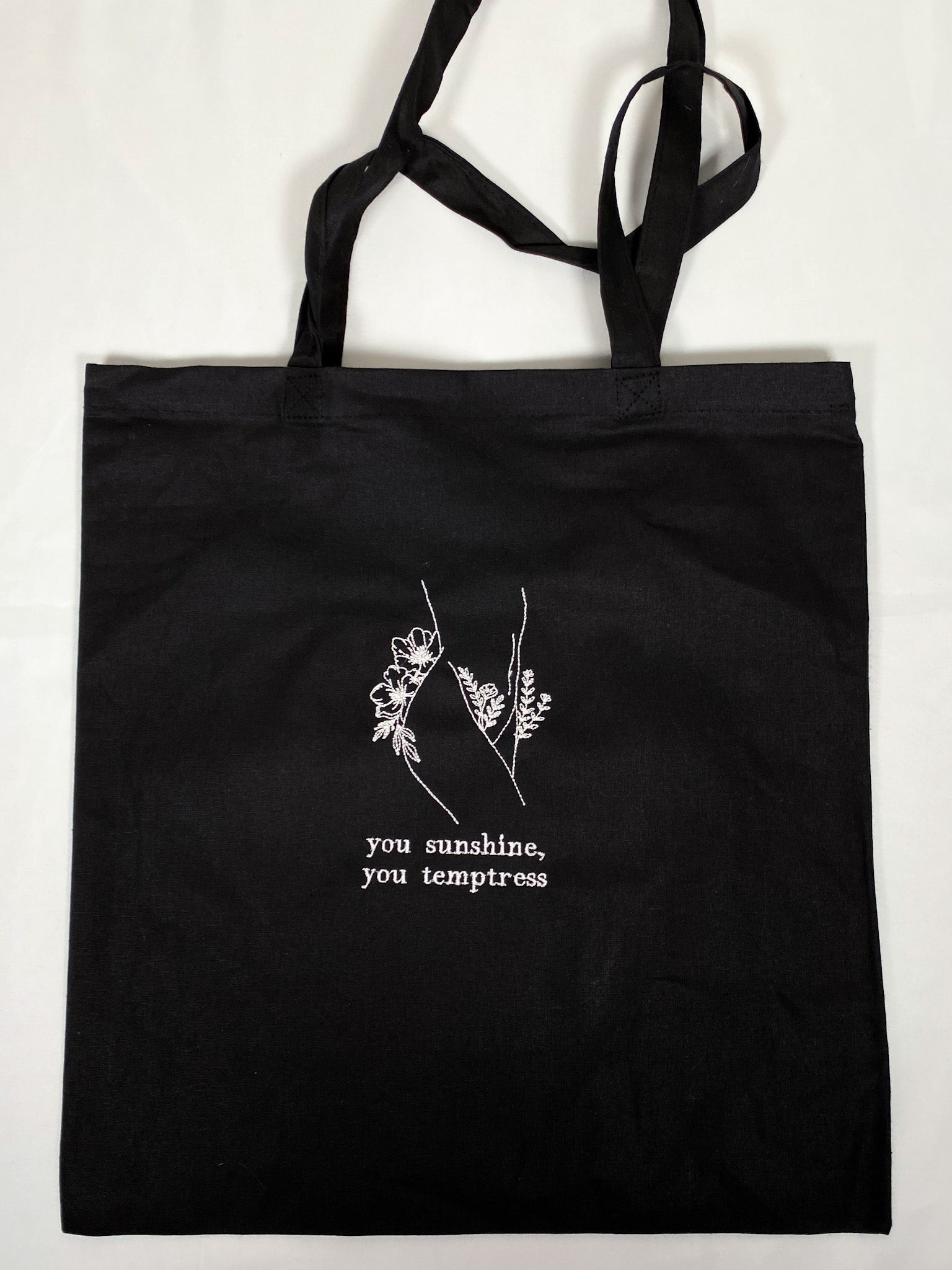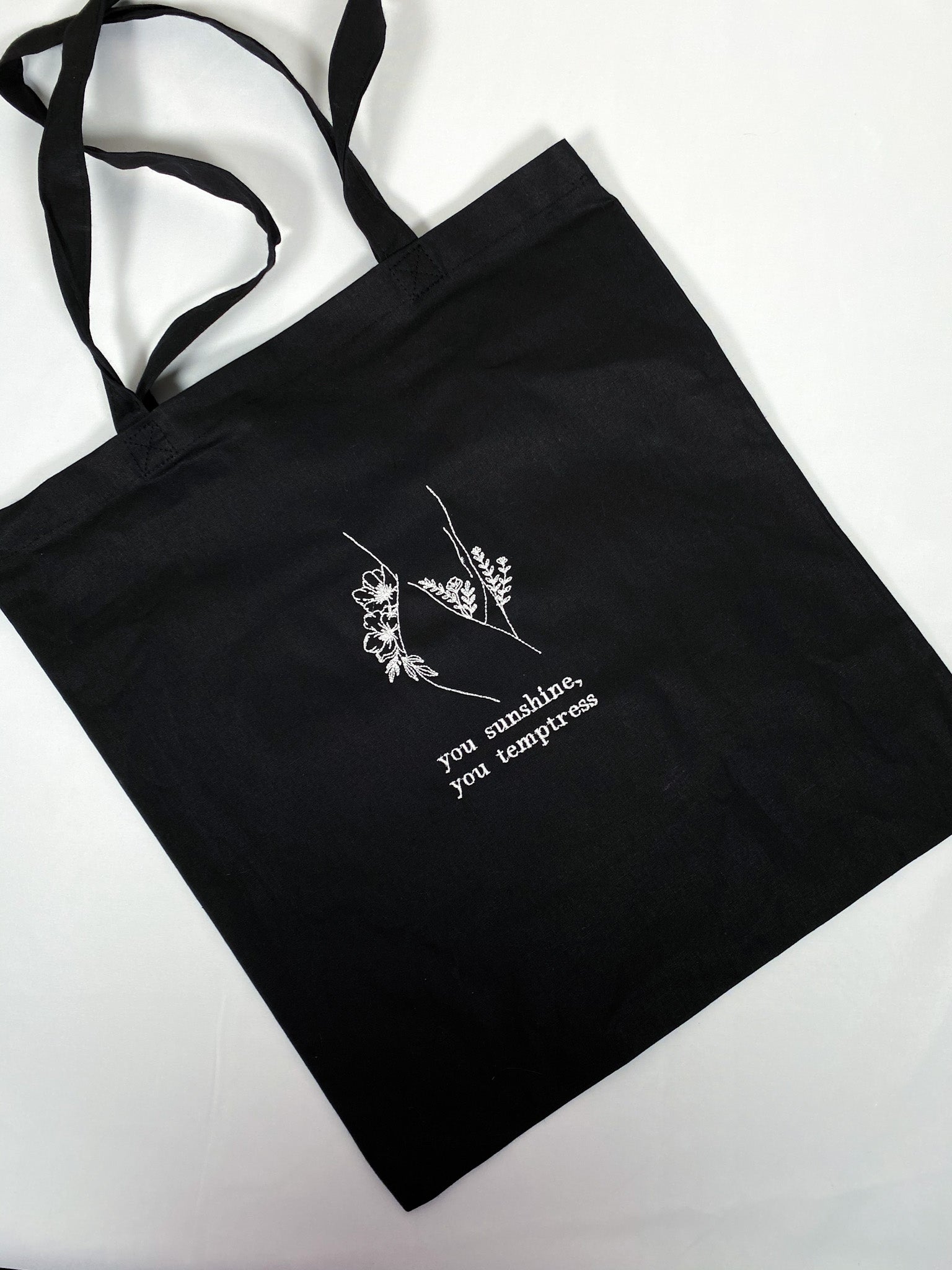 This fine line -inspired design is embroidered onto a Black canvas tote.