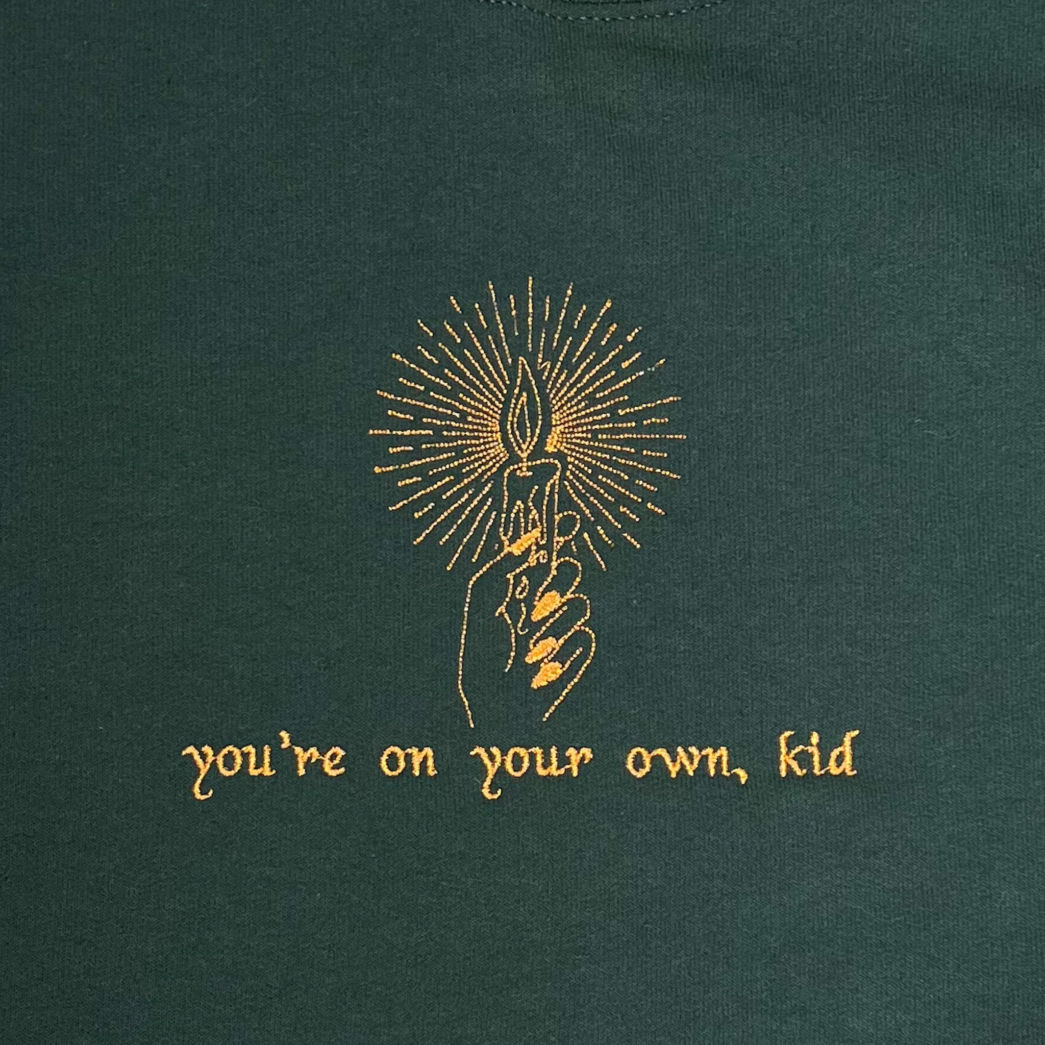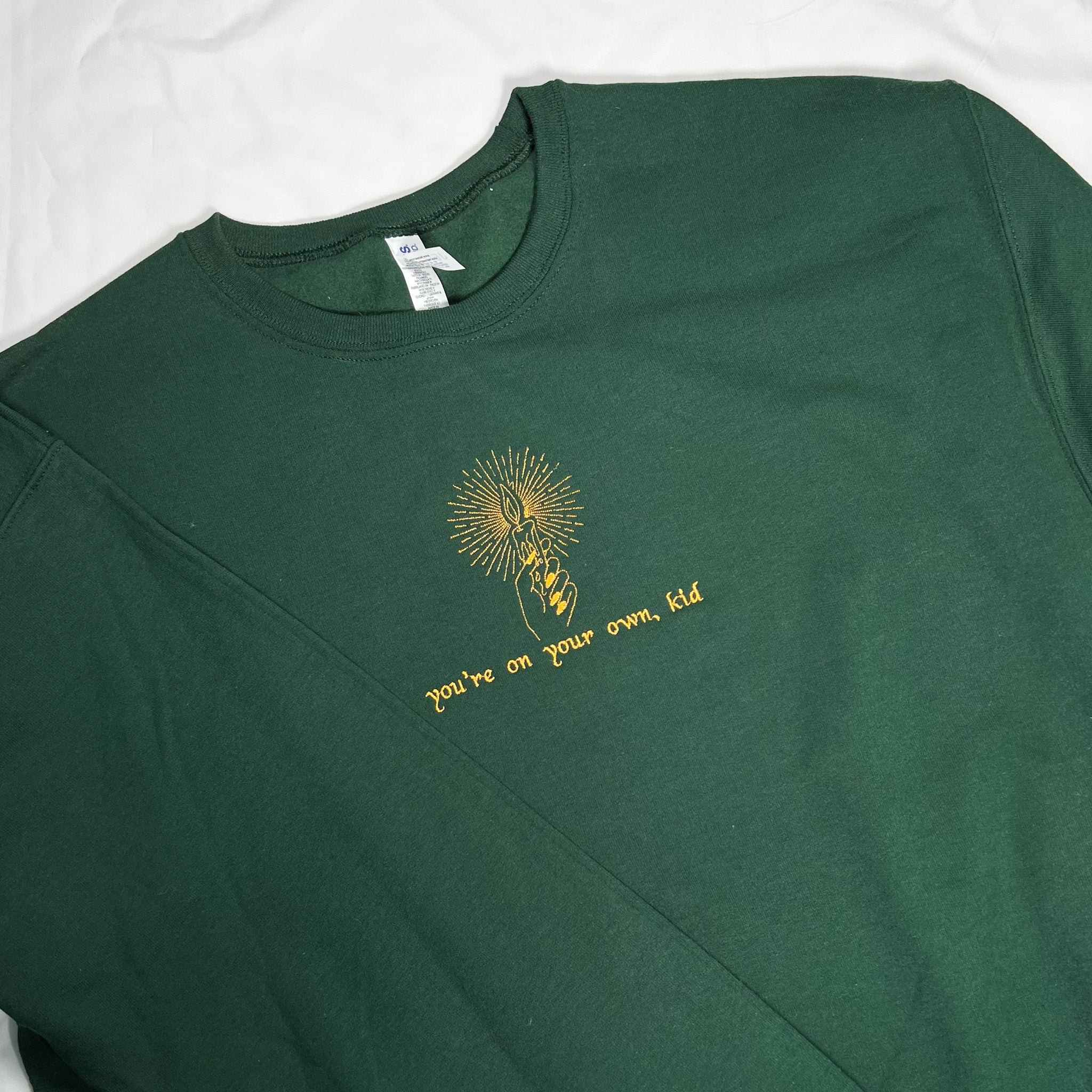 This YOYOK inspired design is embroidered using gold thread, onto a forest green crewneck.
